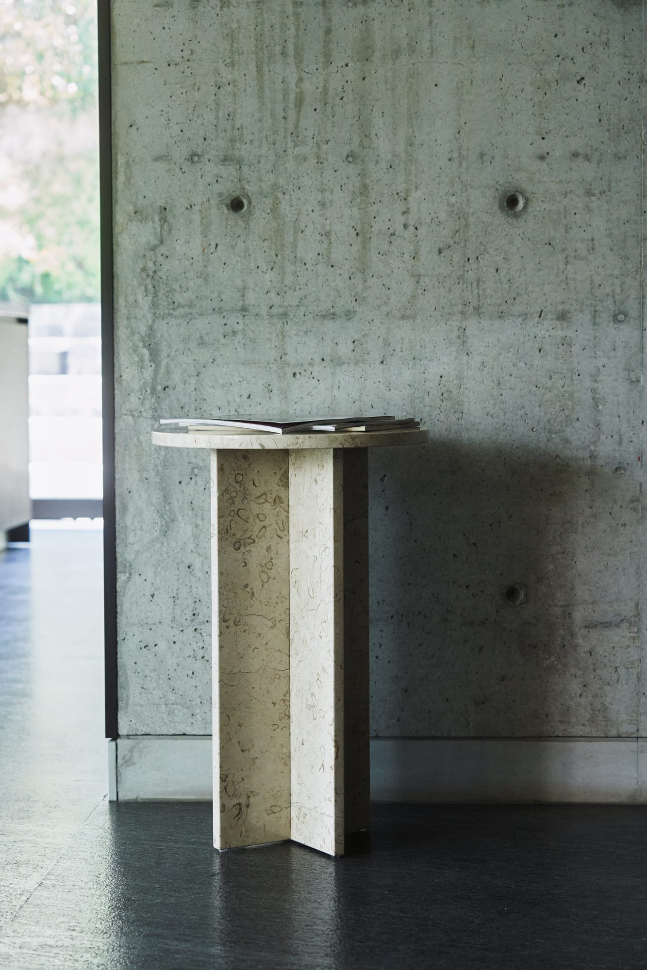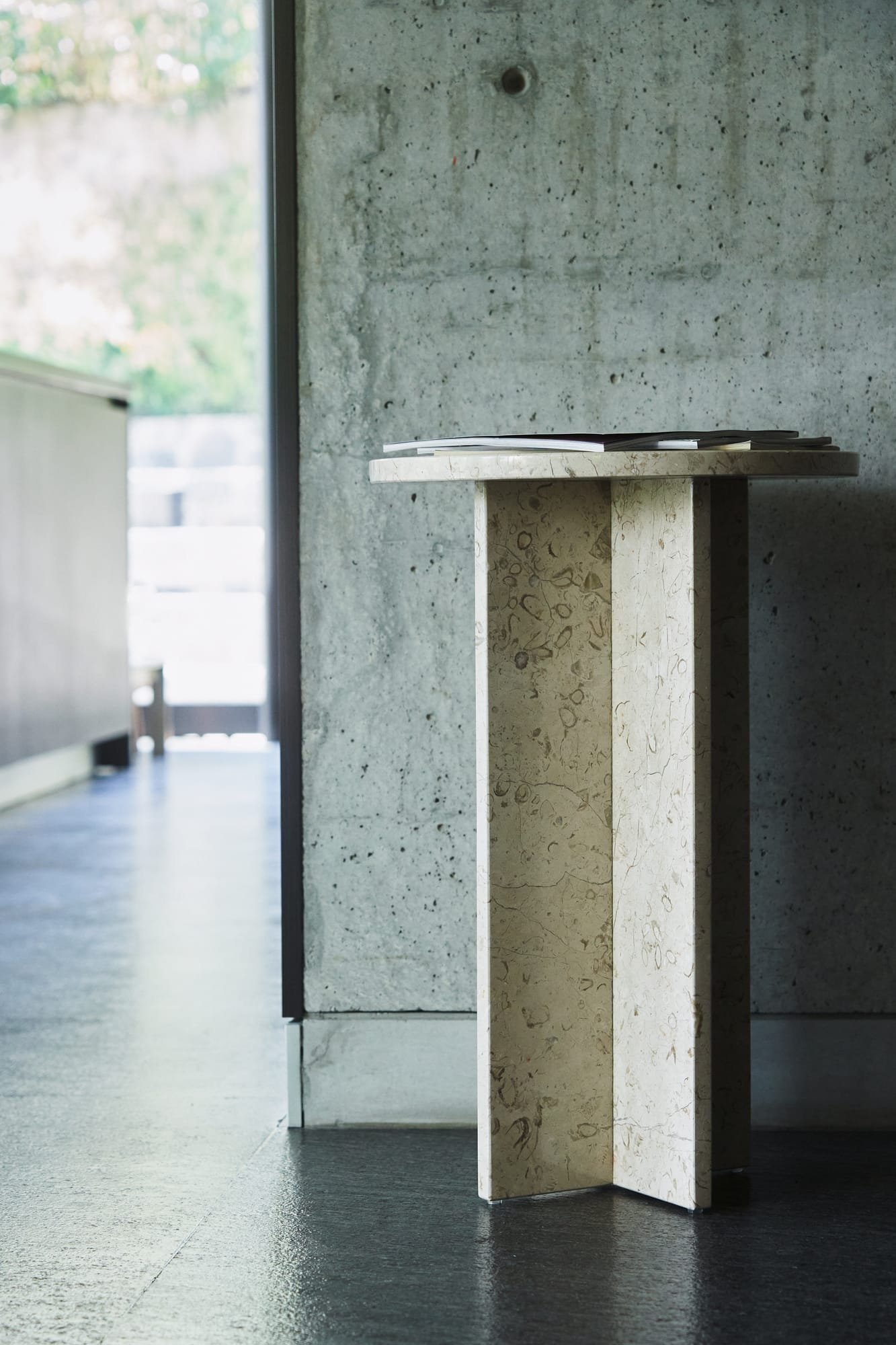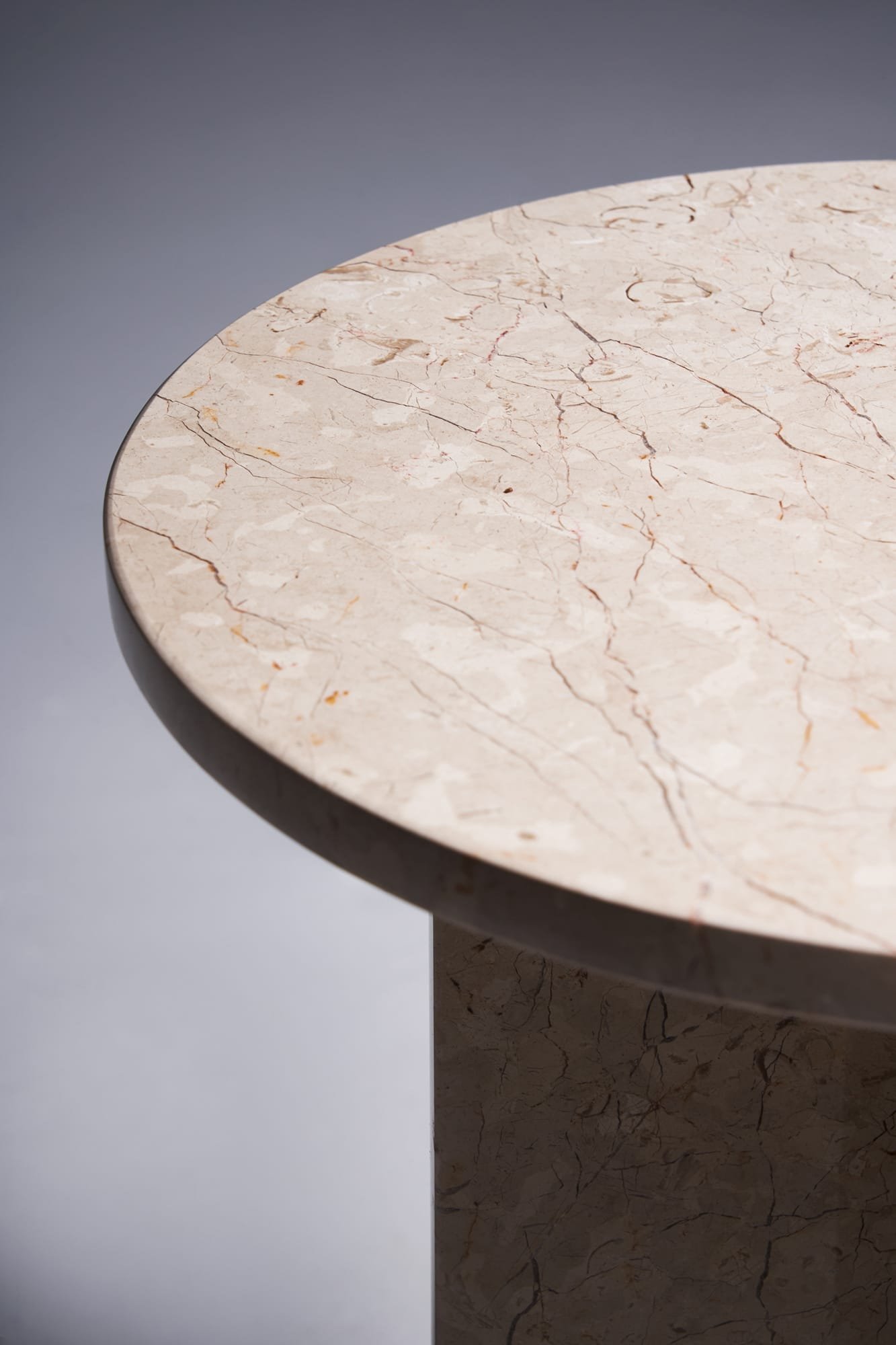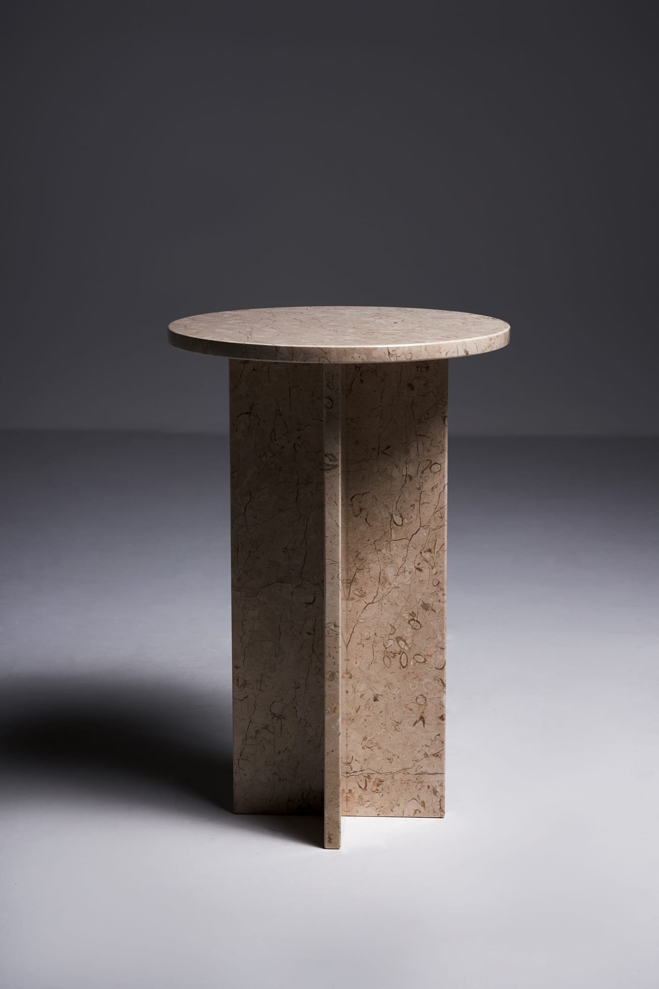 The Mediator in Marble Maya brings a grounded, natural calm into modern spaces. Its soft beige tone is interspersed with fossil-like inclusions that hint at the stone’s geological history. Resting on a cross base made from two solid marble sections, the table is crafted from 100% natural stone with a surface thickness of 2 to 2.5 cm – shaped and polished by hand. Whether in a bedroom, a reading nook or an entryway, the Mediator Maya adds tactile softness and quiet elegance to its surroundings