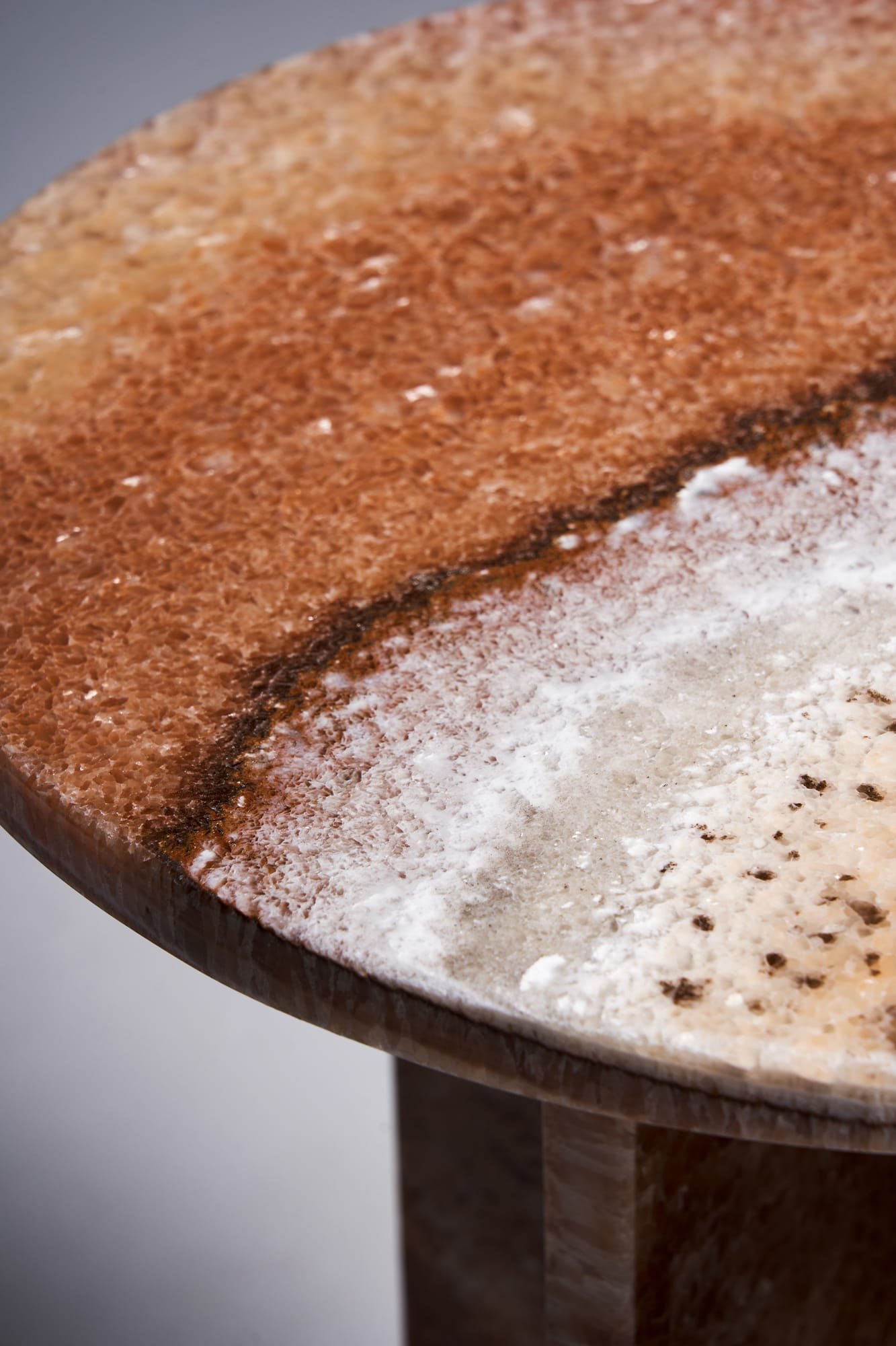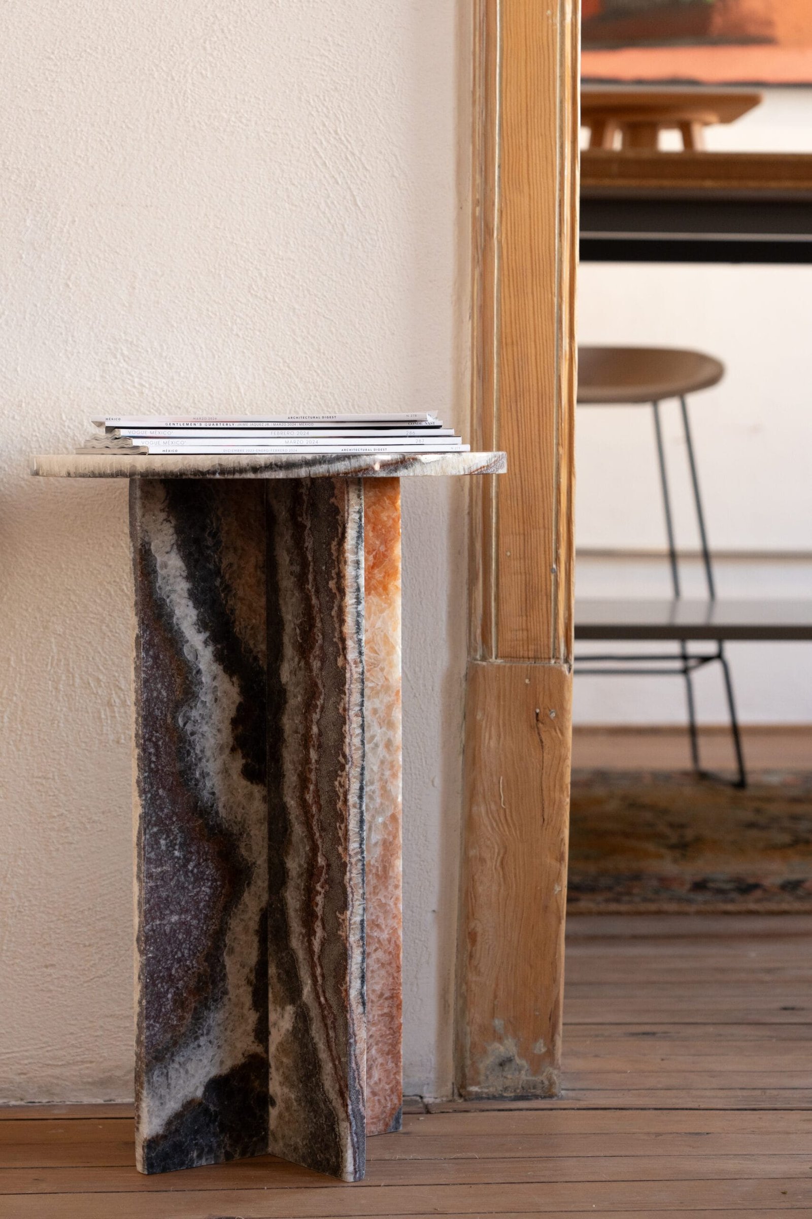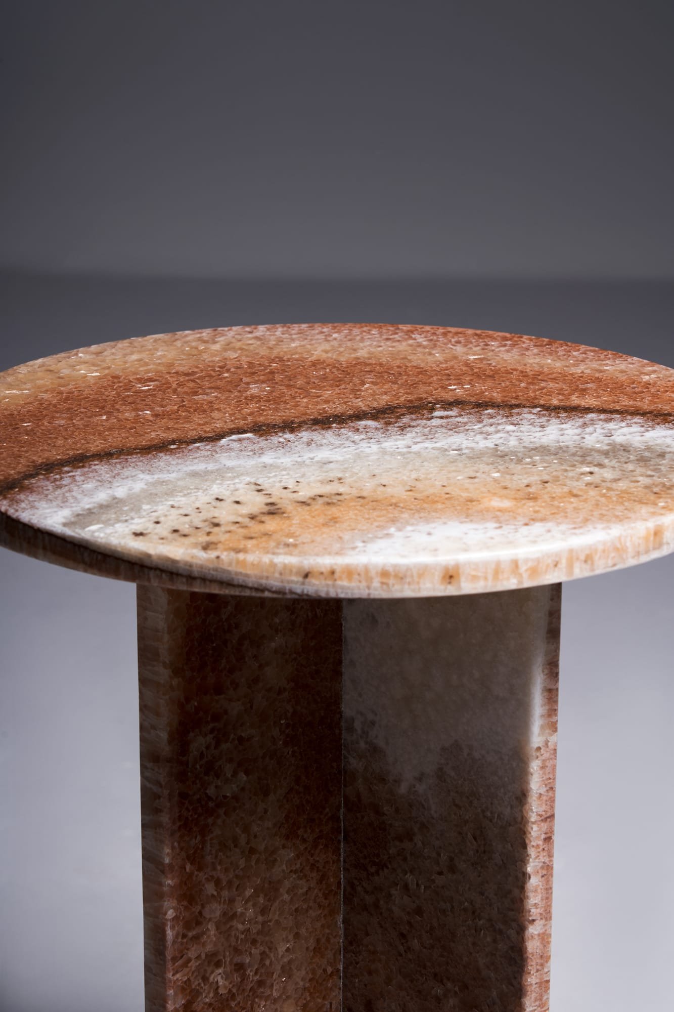The Mediator in Onyx Multicolor is bold, vivid and unmistakable. Its round surface reveals flowing tones of rust, amber and ochre – a visual rhythm that feels almost painted by nature. It rests on a cross-shaped base made from two strong stone elements – minimal in form, confident in presence. Onyx Multicolor is a rare Mexican stone, known for its dramatic color play and distinctive veining. The surface is hand-polished and 2 to 2.5 cm thick. Placed in an entrance hall or between statement chairs, the Mediator Multicolor becomes a focal point – rich in energy, character and craftsmanship.