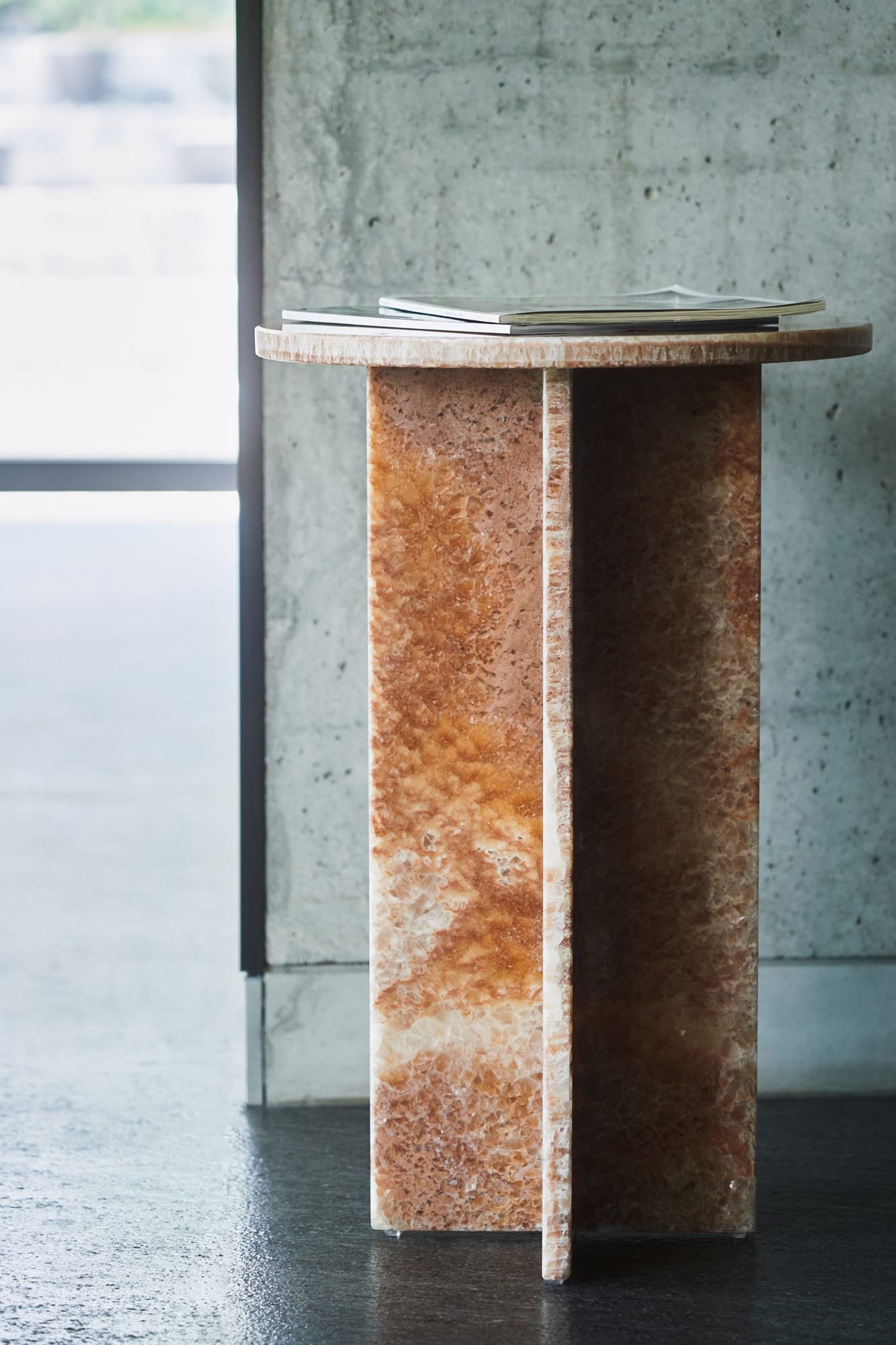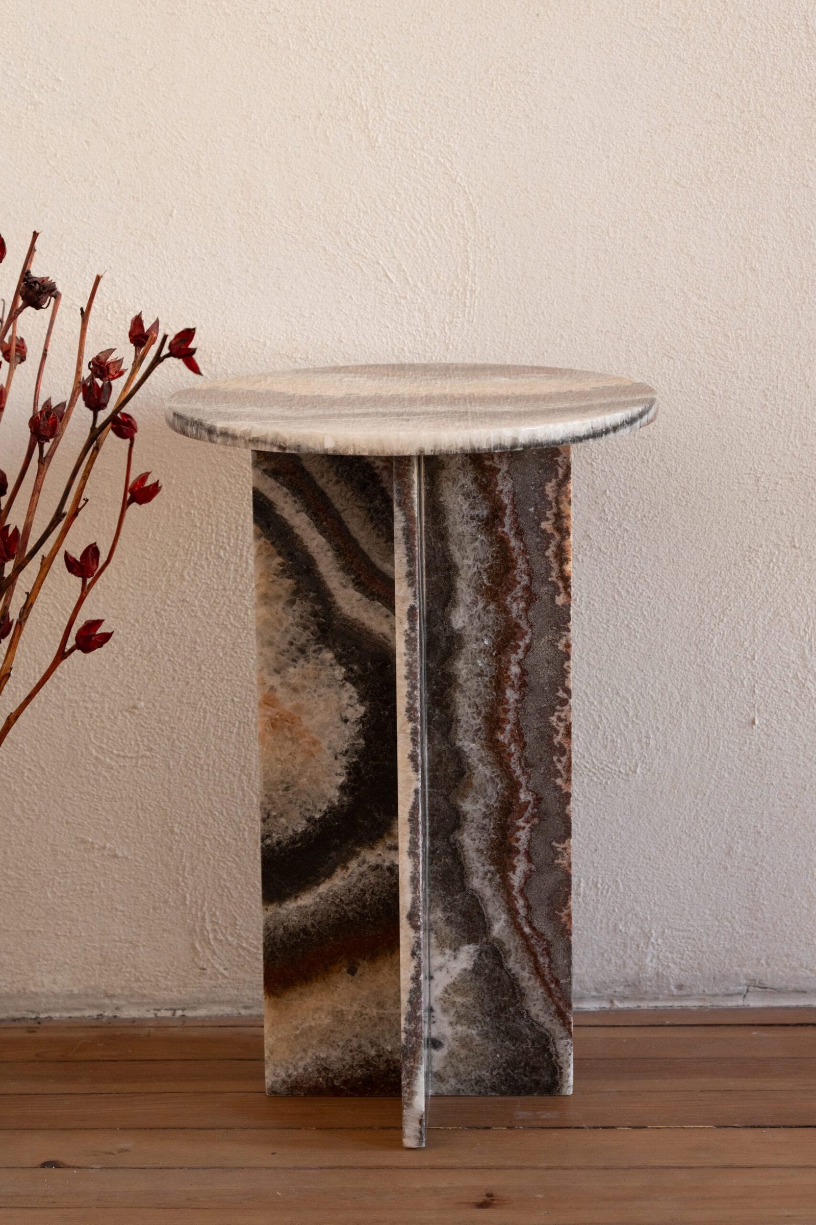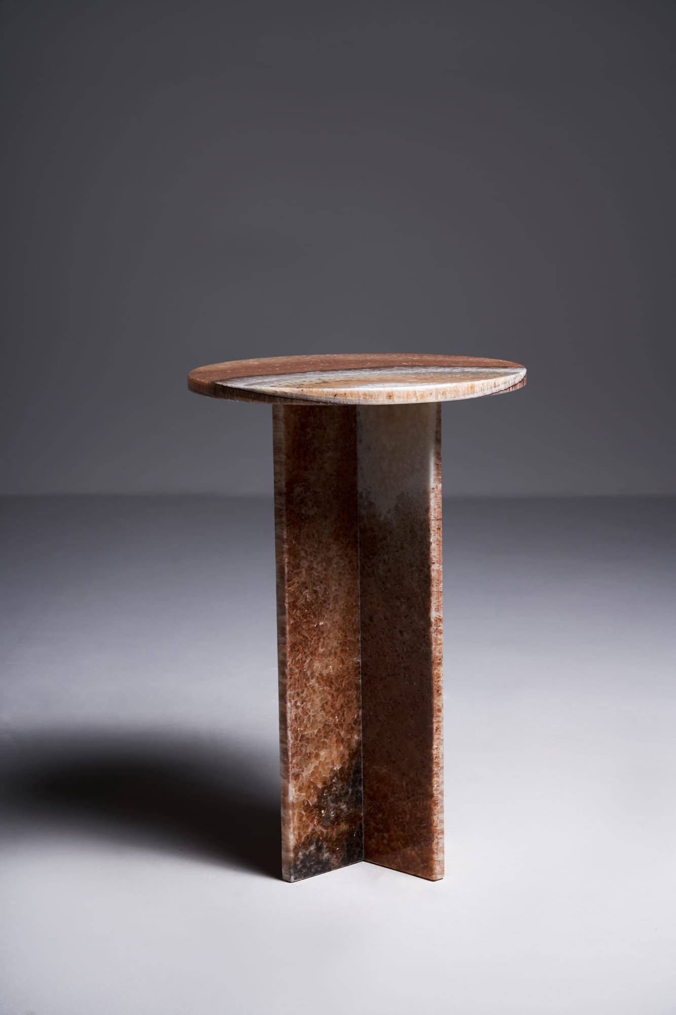 The Mediator in Onyx Multicolor is bold, vivid and unmistakable. Its round surface reveals flowing tones of rust, amber and ochre – a visual rhythm that feels almost painted by nature. It rests on a cross-shaped base made from two strong stone elements – minimal in form, confident in presence. Onyx Multicolor is a rare Mexican stone, known for its dramatic color play and distinctive veining. The surface is hand-polished and 2 to 2.5 cm thick. Placed in an entrance hall or between statement chairs, the Mediator Multicolor becomes a focal point – rich in energy, character and craftsmanship.