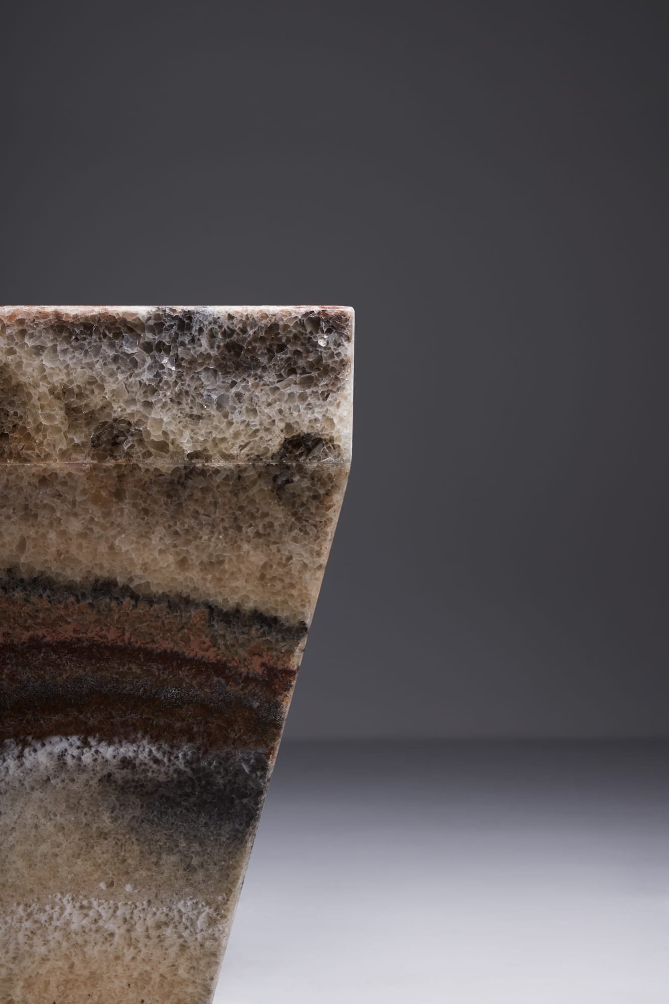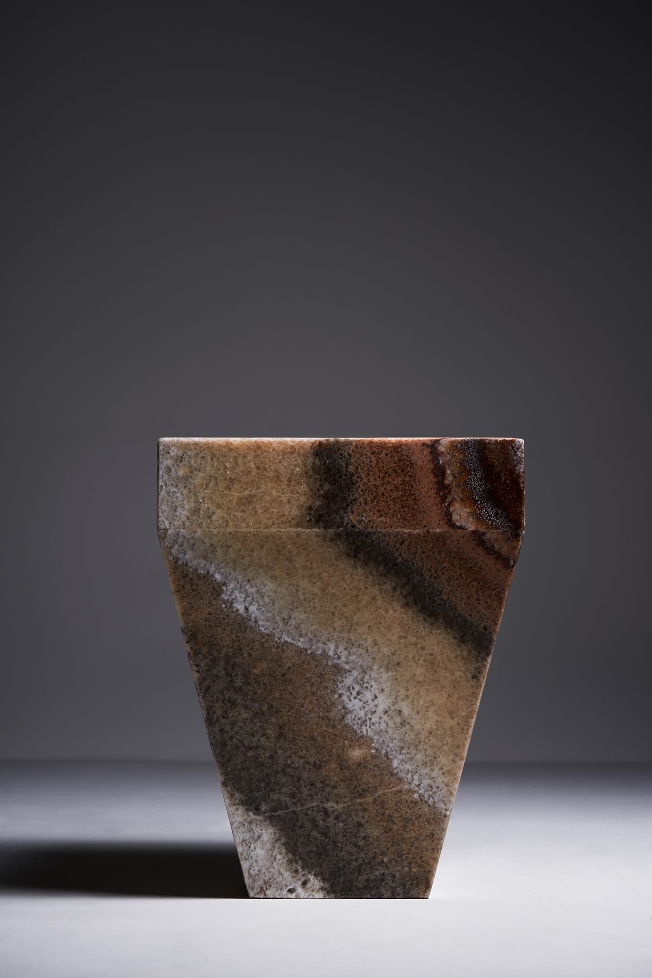 The Shaper in Onyx Multicolor features vivid natural veining in tones of ochre, ivory, and deep rust. Its bold shape adds a sculptural touch while maintaining a sense of balance and calm. It feels like a handcrafted art piece that still integrates effortlessly into a range of interiors. Especially in minimalist spaces, it introduces depth, contrast, and character. Each piece is made from 2 to 2.5 cm thick onyx slabs and naturally one of a kind.