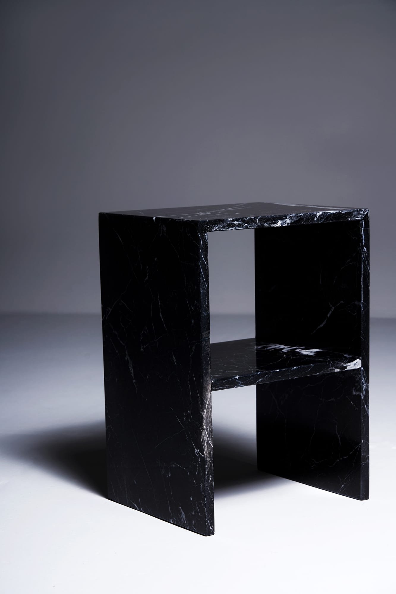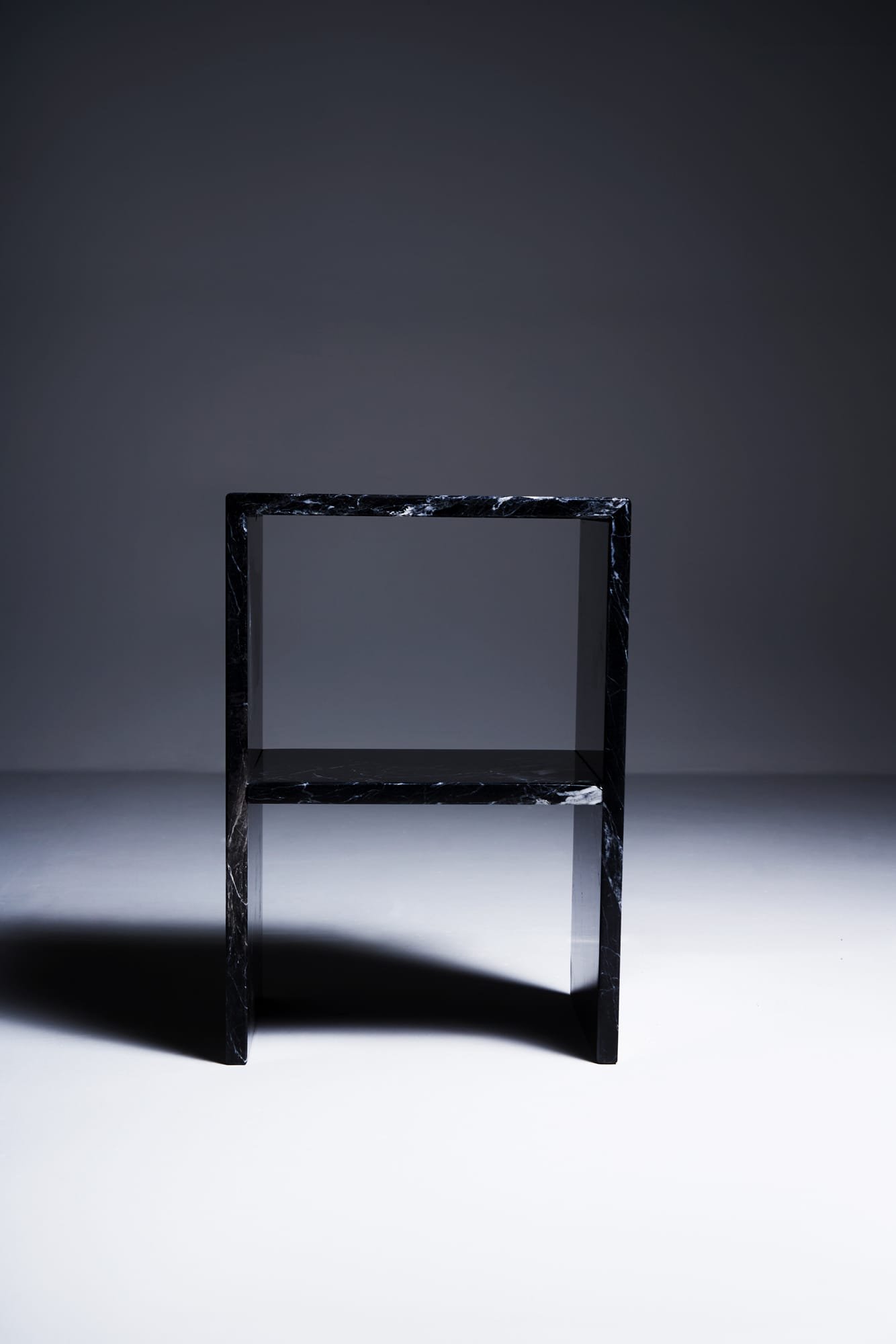 The Sideliner in Marble Queretaro blends deep charcoal tones with delicate white veining to create a strong yet elegant visual impression. The marble is sourced from Mexico and brings a quiet intensity to the space it inhabits. As a bedside table or side table, it feels bold and balanced. The 2 to 2.5 cm thick marble slab emphasizes both quality and clarity of form. Its graphic contrasts make it especially striking in minimalist or monochrome interiors. A piece that embodies precision, strength and timeless design.