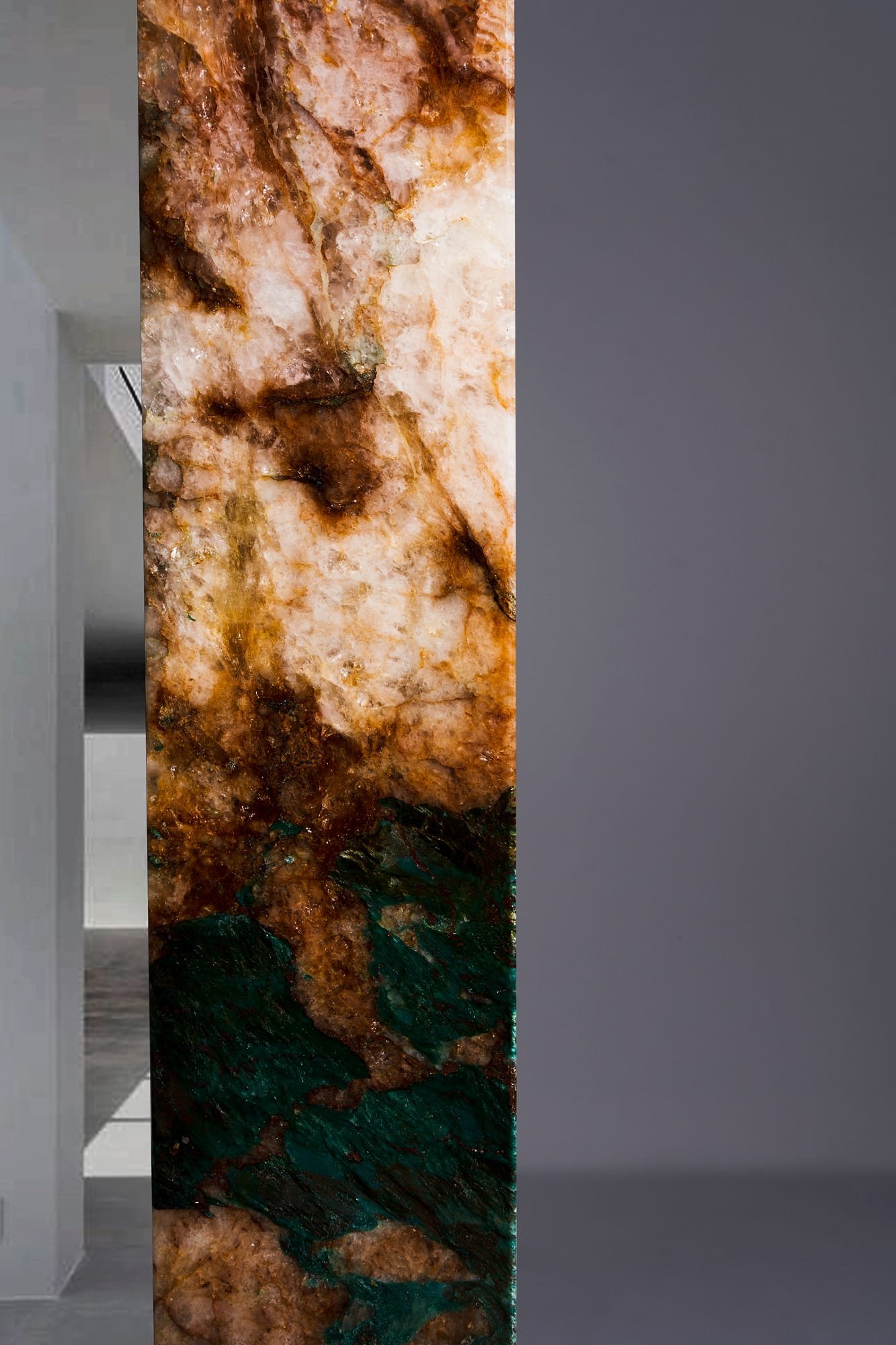 Luminous greens meet mossy tones, beige crystal veins and soft blues. The complex structure resembles landscapes, minerals – a piece of the universe captured in stone.